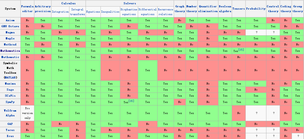 软件的定位不同,这个图里的都是大通套数学软件,真正的专业数学软件这里也没列出来。这些软件里有些是面对数学教育的,比如说maple,配有一套数学考试系统;有面对工程计算的,比如说mathcad,这就不多说了;大部分都是面对科学计算的;只有mathematica的定位特殊,想建立一个数学计算的国际标准,可具体到哪个功能都不如同类的专业数学软件来得牛掰。