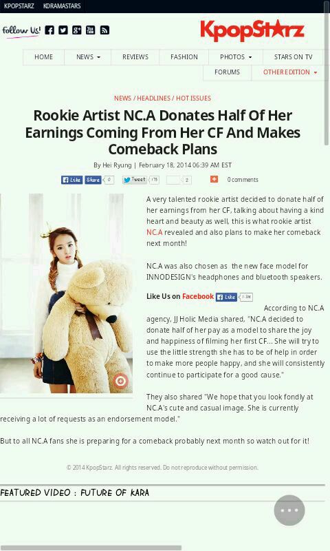 2013년 ‘교생쌤’으로 데뷔한 신인가수 NC.A(앤씨아)가 생애 첫 CF계약과 함께 계약금의 절반을 기부하기했다는 훈훈한 소식을 전해왔다. 최근 NC.A(앤씨아)는 디자인 회사 이노디자인(대표: 김영세)의 디바이스 브랜드 라인인 이노디바이스의 헤드폰(이노웨이브)과 블루투스 스피커(이노튜브)의 모델로 생애 첫 CF 계약을 체결했다. 지난 12월 방영된 KBS 2TV ‘해피투게더3’에 시식요원으로 출연한 NC.A(앤씨아)의 모습을 본 이노디지안 김영세 대표가 직접 소속사로 러브콜을 보낸건시 모델 계약의 계기. 소속사는 “방송을 통해 NC.A(앤씨아)의 귀엽고 꾸밈없는 모습을 좋게 봐주신 것 같다. 방송 출연 이후 계속해서 광고 섭외 문의가 쇄도하고 있으며, 현재 다양한 분야에서 관심을 가져 주셔서 얘기를 진행 중에 있다” 고 밝혔다. NC.A(앤씨아)는 계약이 체결되기 전 이노웨이브 헤드폰에 대해, “개성 있는 디자인에 예쁜 컬러까지 다양한 스타일링이 가능한데다, 성능까지 좋아서 친구들에게 선물하고 싶은 아이템” 이라는 생각을 가지고 있었다고. 또한, 이노웨이브를 평소 그녀가 즐겨 입는 스타일에 포인트 아이템으로 매칭하고 있다며, 스타일링을 한층 더 돋보이게 해준다고 밝혔다. 특히 NC.A(앤씨아)는 생애 첫 CF계약 성사 소식과 함께 계약금의 절반을 좋은 일에 쓰기로 했다며 “생애 첫 CF 촬영이라는 기쁨과 행복을 다른 사람들과도 나누고 싶다는 생각에 결정하게 됐다. 더 많은