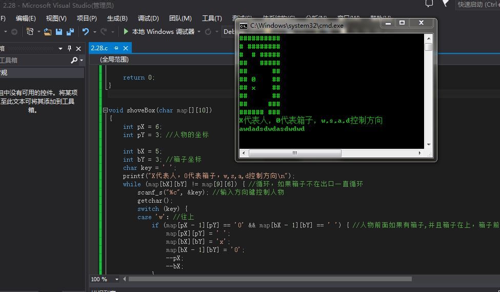 printf("X代表人,0代表箱子,w,s,a,d控制方向\n");