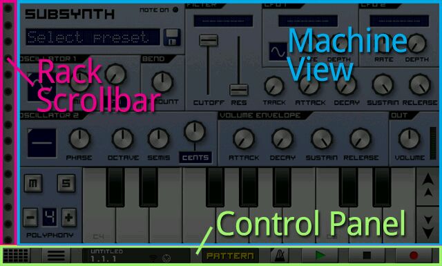 caustic有几个版本。目前最新是3.0.0.刚上手还是用caustic2比较容易,自己很容易能摸索出大部分的功能。不过缺点是只能添加8个machine(说明书这样叫的),并且只有四种可以选择(subsynth,pcmsynth,bassline,beatbox)。等于说最多只能有6个乐器轨(还是7个?),音色略显单薄。另外一个各个轨道的调音台和一个总轨的machine是不能删的