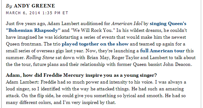 来源rollingstone.com/music/news/q-a-queen-adam-lambert-talk-new-tour-pressure-and-john-deacon-20140306
