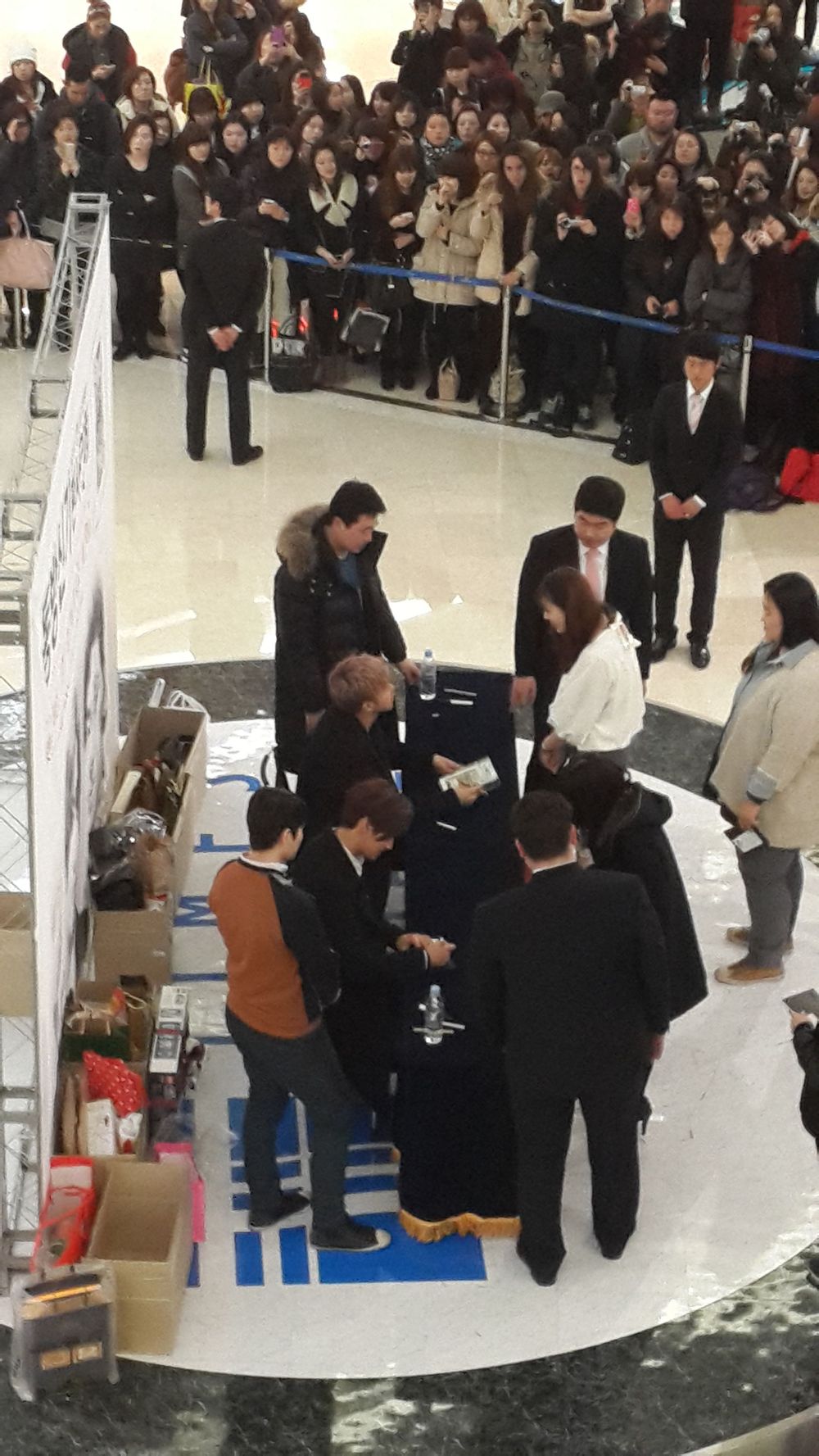 如此不淡定加上距离又如此的近,昌珉同学怎么可能不休息我们一下下呢,所以这个角落里的三个中饭已经被他激光扫射了好几遍了。大欧巴再次压轴登场,衣服比上午的还要青春好多,出来贴心的跟大家打招呼。PD哥哥人也好好,特别提醒他“允浩呀,这边的饭可能看不很清楚,表示一下吧”于是大欧巴歪过头笑眯眯跟我们招手问好耶,他的右边也有十几个饭他却没有特别的做什么,这个举动引起正面粉丝的不满,大欧巴还提我们说话“她们看不清楚嘛”真是暖死我了,为了这个大暖男,真是排几天队也值得了。昌珉同学依然是不说话,依然是大欧巴各种暖场各种拜托大家好好应援,要做的比上午好种种。我身后有个韩饭“昌珉哥也说句话吧”小欧巴还是不讲话,但是用嘟嘴摇头这个行动回答我们“我不高兴”,虽然他没怎么讲话但是他小声哼歌,声音很小以至于都没听出来他哼的什么,大欧巴也有哼歌,哼的苏力苏力,这个听的很清楚。