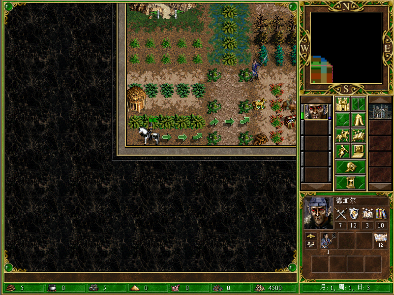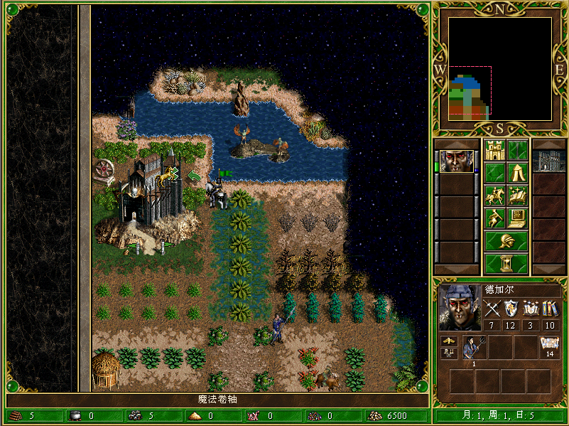进入游戏后,先把旁边的矿石和木材捡起,然后会在下图英雄所站的位置触发一个事件(路边捡到2500黄金)——正好够建魔法塔,但我没急着去建和买书,而是继续往前去捡宝箱
