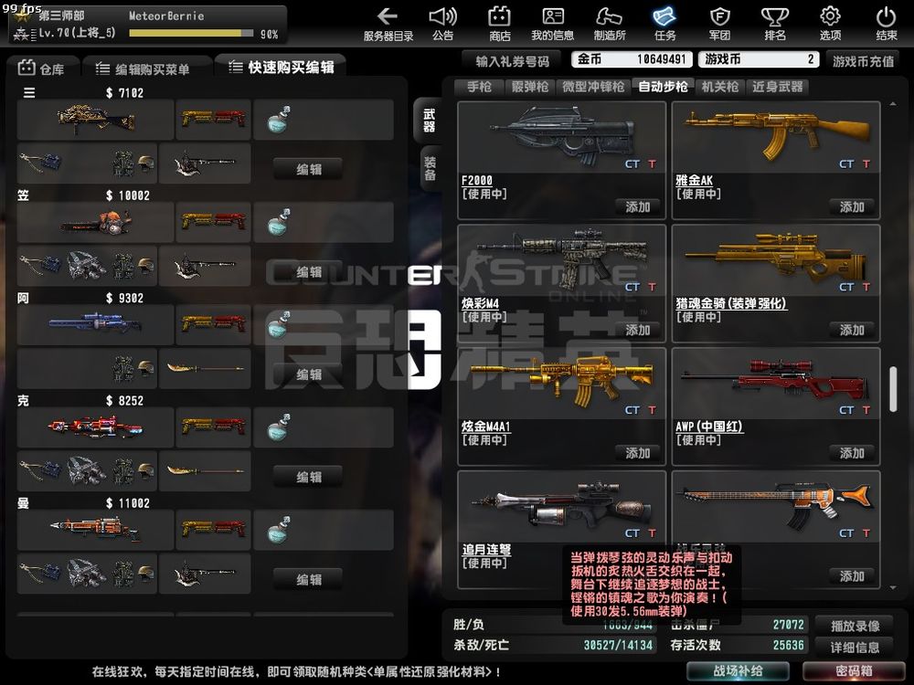 装备道具:猛虎纹身、1完美填单、2完美后座、1完美伤害、2连射还原、2命中还原、2填单还原、1重量还原