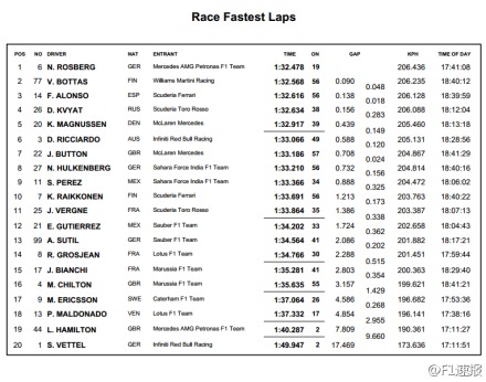 螺丝的最快圈速是在赛程初期跑的,是重油,此后只是在巡航,法拉利是轻油,奔驰如果是轻油的话速度可以再提高差不多2秒,贼队比法拉利快不了多少,威廉姆斯确实快,重油情况下很快,但快不过奔驰。