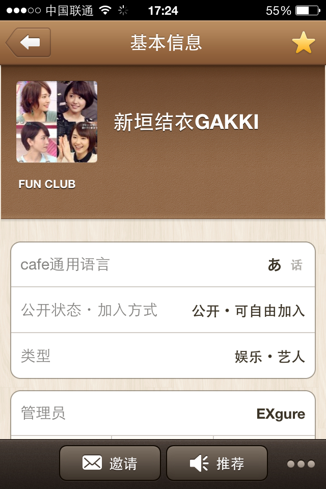 找到了之前建好的line cafe小站,新垣结衣的,各位用line的gakki fun手机党朋友一起来玩吧!使用app为line cafe。大家一起fun Gakki,发图聊天吧!