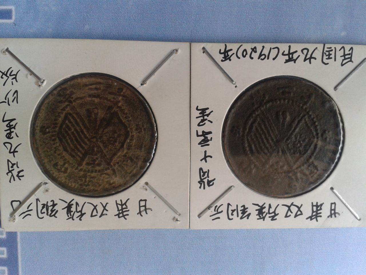 再上一对己已新江喀造民国双旗铜元,比上枚阿造较多见。这两枚党旗国旗是相反的,但评级是一样的,非百不可入也。改天发些西藏铜板,请吧友欣赏。