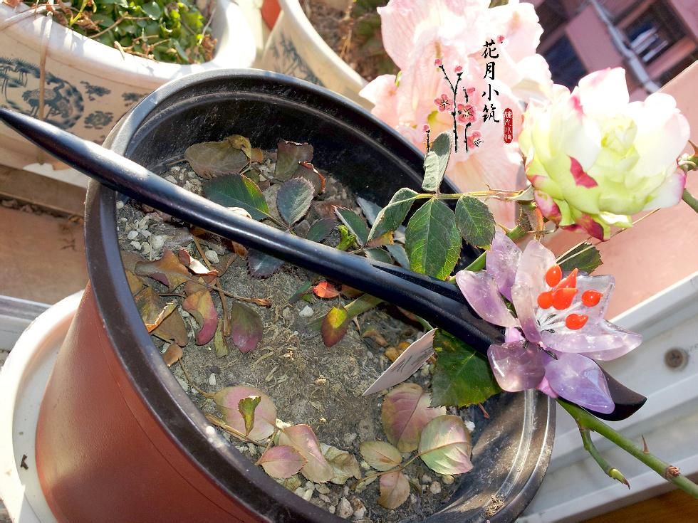 一共只买了10片紫水晶菱形花瓣,做了一朵重瓣花。配上木质凤簪,虽然没有华丽的流苏、各色珍珠玉石陪称,但是反而突出了玉簪花本身的美。私以为,这样也更日常,唯美而不高调,想想那些大朵大朵、配饰华丽的大朵玉簪花,日常佩戴就太过、太招摇了。