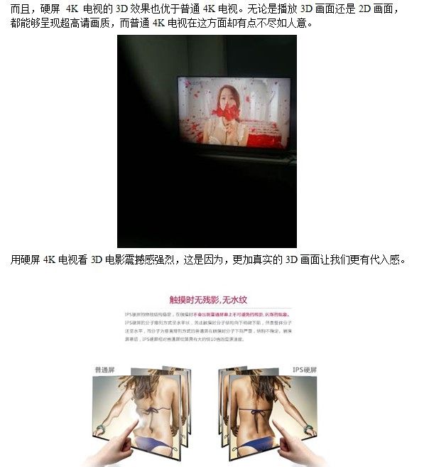 硬屏4K电视搭载高端的不闪式3D技术和IPS硬屏技术是现在最高端的技术了,它的效果非常赞。