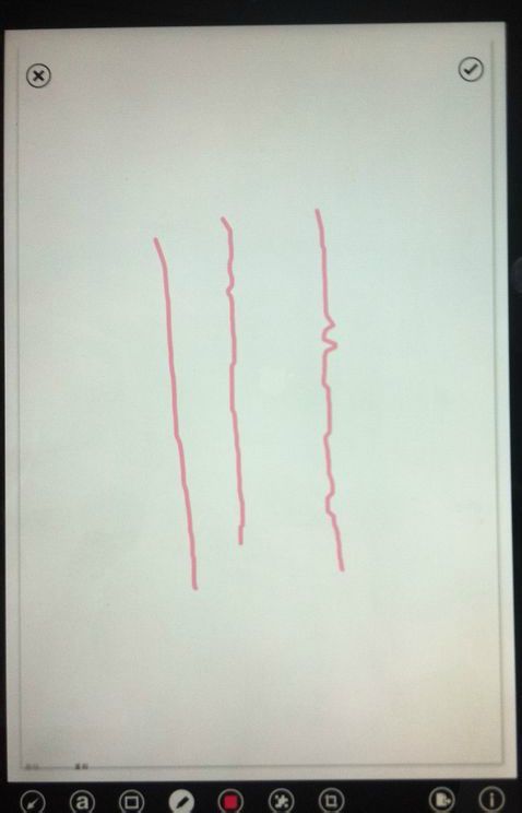 电容笔在自带的印象笔记 画笔模式下随便画三条竖线的情况,上面是刚刚画完效果,下面是软件修正过的效果。。。不排除楼主是个手残画不好或者软件画笔功能较差的情况。。。不过在ipad下不错= =