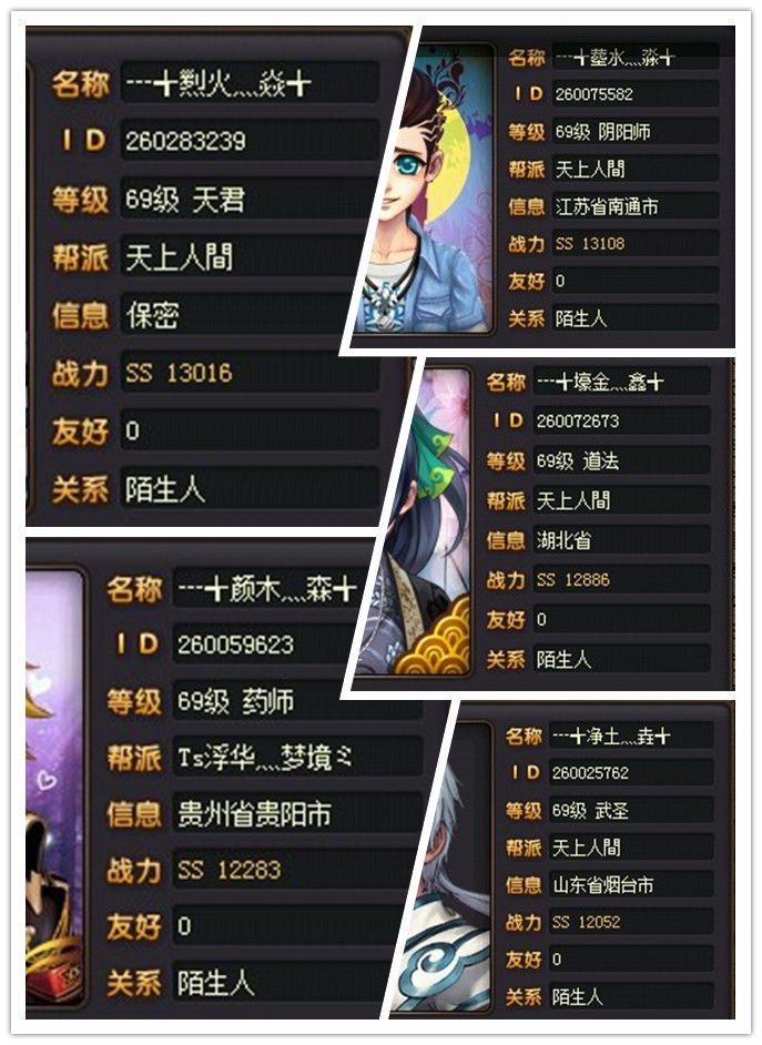 下面看看队伍的5个成员的资料卡吧~分别是 天君,阴阳师,道法,药师,武圣。(真是一个很特殊的队伍配置呀!据说这是法攻型国标队)