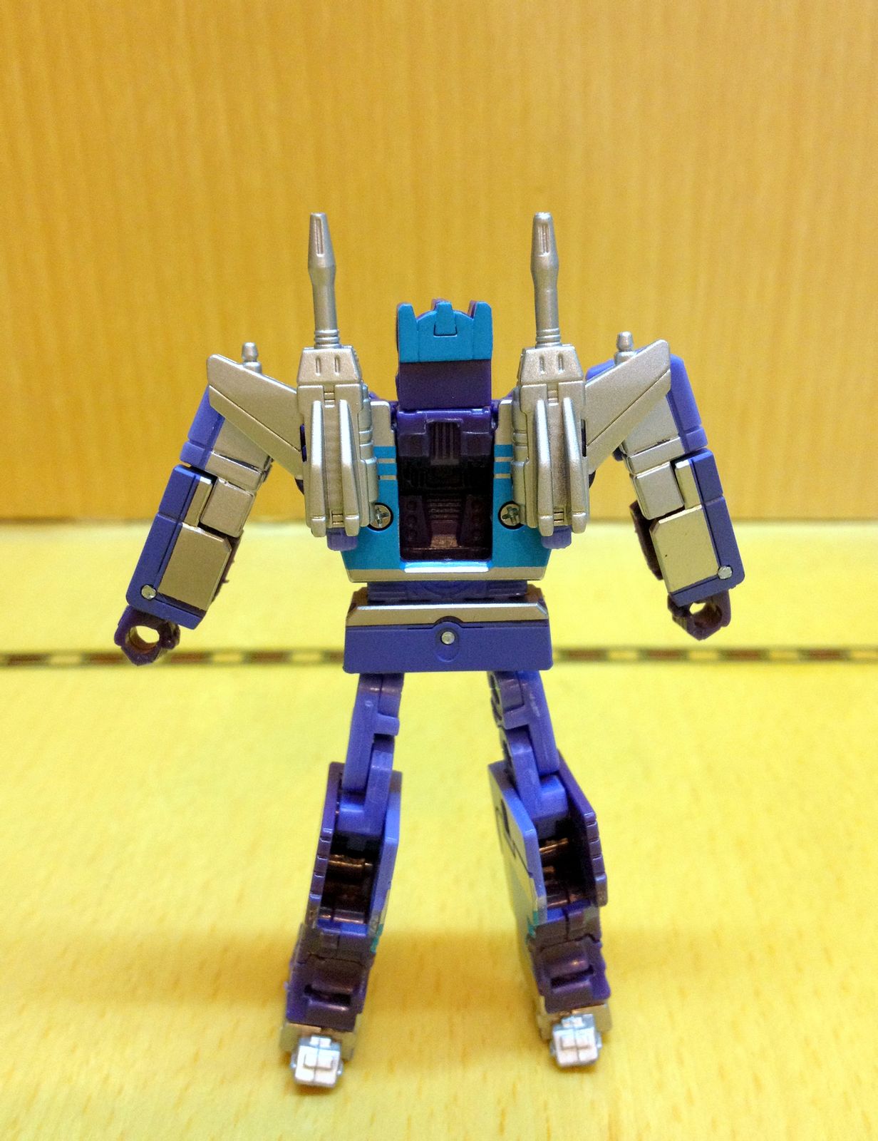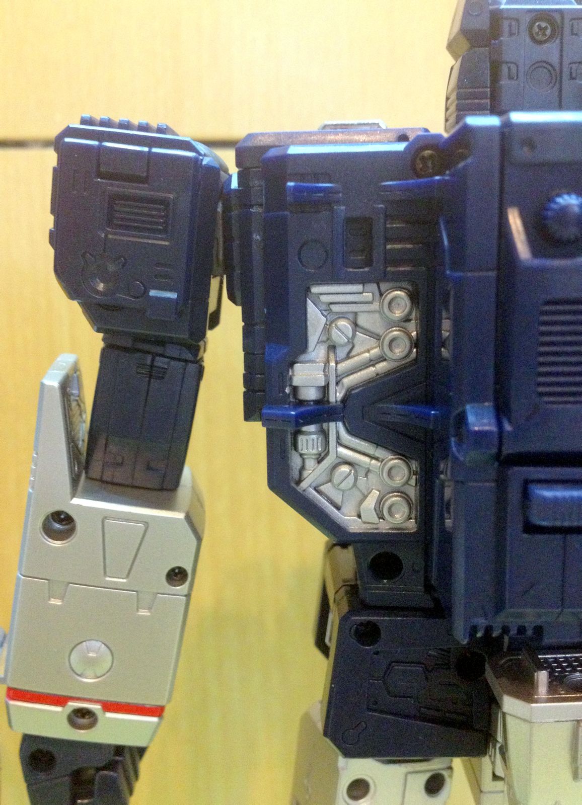 然而,又是然而。虽然入手以后非常满意MP13的各方面表现,但是既不手贱也不天生神力的我还是很轻易地扯断了激光鸟的尾翼,具体情况请见纯文字吐槽贴:http://bbs.actoys.net/read.php?tid-1701768.html (关于这点后面详细测评时还会提到,希望可以给没入手的以及入手了还没把玩的兄弟提个醒或是做个参考)。虽然激光鸟折了尾翼,但这并不影响我对手中这款MP13的喜爱,在我眼里,MP声波是一款接近完美(是接近,注意是接近……)的模具,很用心很到位很传神地诠释了G1声波所具有的魅力,也基本上可以说是无愧于MP这个响亮而傲娇的称号了。于是我开始无限期待美版声波,期待另一种感觉的MP声波,期待五磁带,期待得以满足作为声波控双入MP声波模具的小奢望,更期待以此弥补一下折