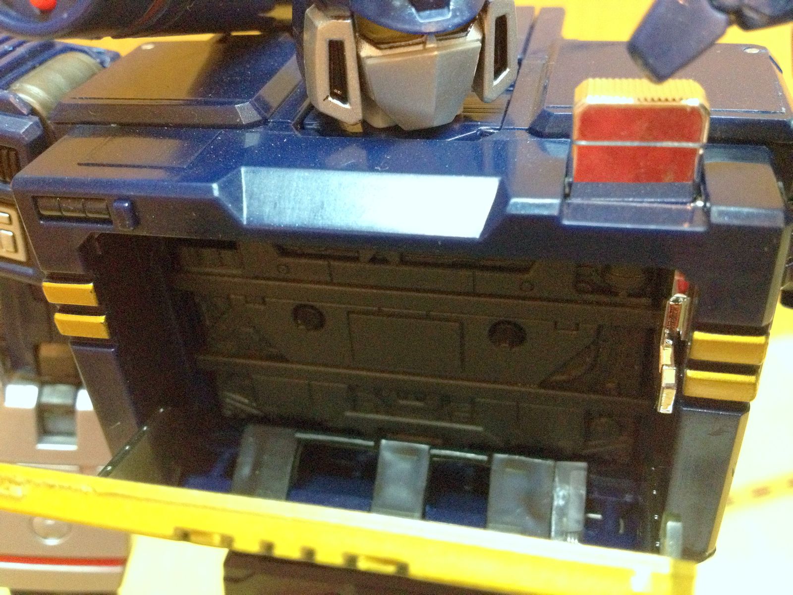 翻到背面来看,G1老玩具就显示出优势了,虽然可以清楚看到声波的脑袋,并且同样也可以看出两条手臂,但至少没了外露的电池,也没有太多的空洞,并且还多了个可以卡腰带的装置……年纪跟我相仿的朋友估计多少都有在腰带上卡个WALKMAN,戴上耳机,出门装13的经历吧……