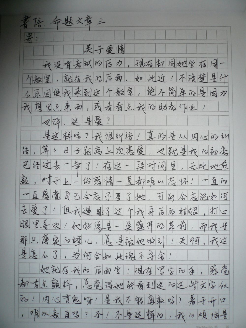 我坐在她的前面,尽情地写一些胡言乱语。我是知道我喜欢她的,每当我写下这些字的时候,总怕她会看得见,心里面有鬼啊,颤抖的手有时候握笔都有点困难。天啊,我竟然又会有这般胆怯。胆怯却又想见,想见却又不敢言。