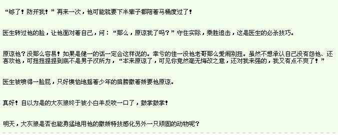 医生又一次目瞪口呆!这回不是震慑于他诱人的身体,而是他出乎意料的洒脱自如和落落大方。虽然那天的检查已经领教过,可这其中又好象又点不同。