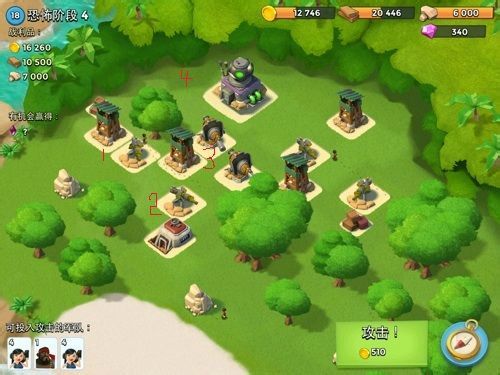 1.用导弹解决到1处的箭塔和机枪,大概3发搞定。剩余能量,可选择留着冰冻或者治疗,我是给了2号处的机枪一发。