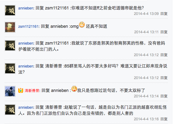 他道德帝太厉害,他就一个年轻版的ff。他不光黑赵敏他以前还是刷屏黑小龙女。喜欢在金吧太多的诉说自己的私人情绪。比如上次置顶骂一个人,这次骂童话