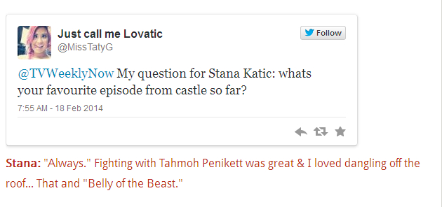 We were happy to oblige, and ran the story called Queen of the Castle: Stana Katic Says Camaraderie is Key to the Show’s Success in the magazine and on this website.