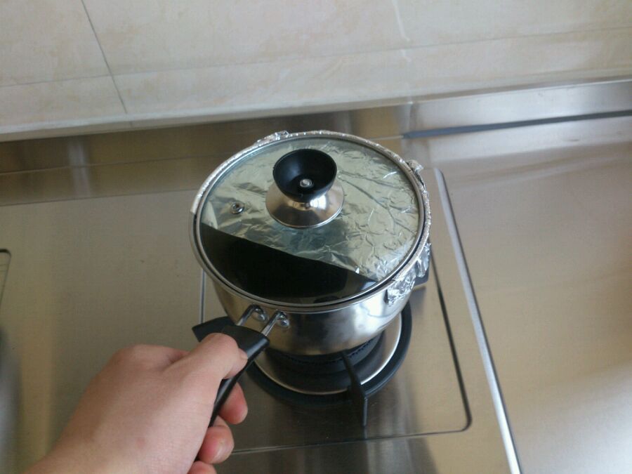 预热奶锅……奶锅是我自己加了锡箔纸当盖子,用铁丝箍一下。