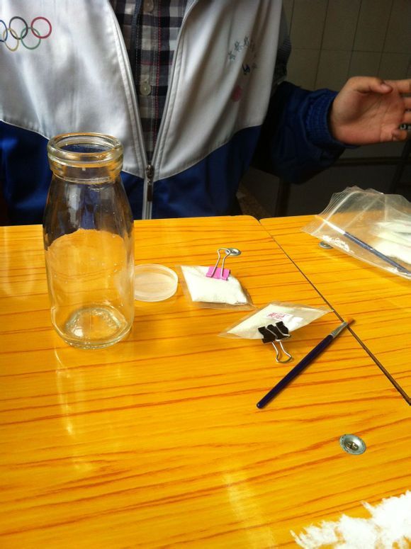 先来材料和备品。玻璃瓶。荧光沙。环氧水晶胶。这里我用指甲油代替了。小刷子。