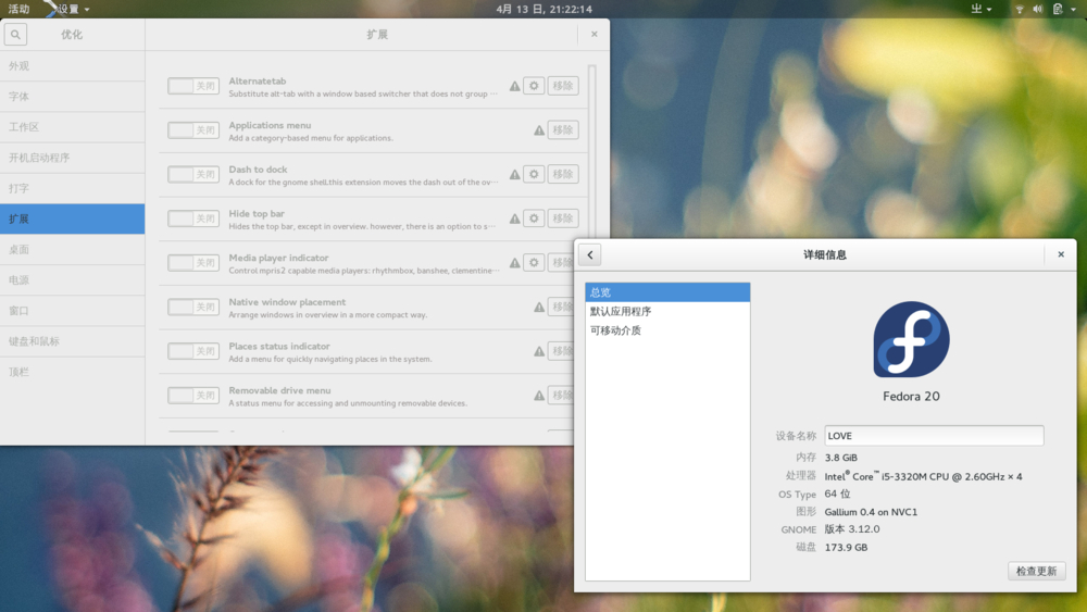 以上是我用的扩展,其中第4个不可用但gnome3.10能正常使用,这个扩展的作用是隐藏最上方任务栏,如果鼠标接触到上方区域则自动出现,跟mate中任务栏自动隐藏功能一样,mate自带,gnome3 没有,所以说gnome3没有扩展总感觉别扭
