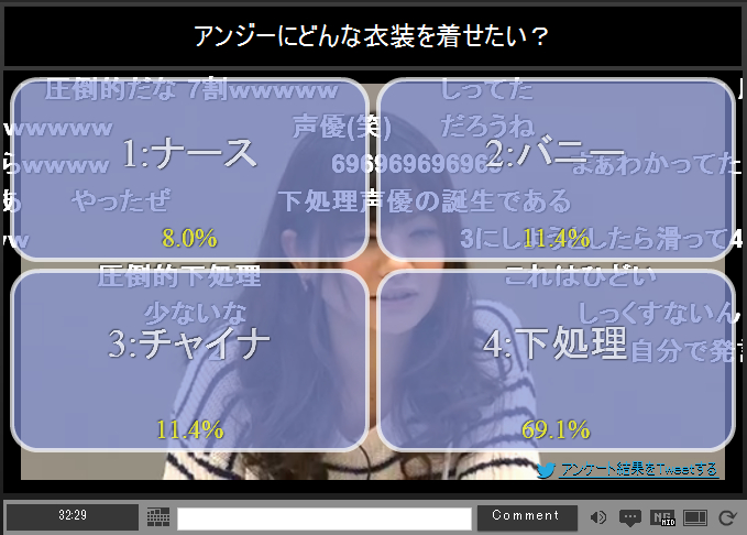 好久没有上了,没想到nico生放送现在出了现场投票的功能。放送者可以现场发布投票,选项会直接出现在屏幕上,所有观众都可以投票,然后现场统计出结果。