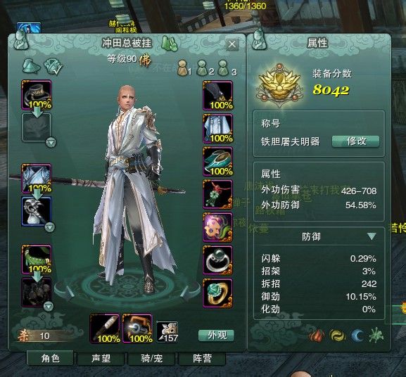帽子大明宫外防加速,护腕无名外防命中精简,衣服25人五营,裤衩25人五门,鞋子狂战,腰带侠义,棍子是去年的冬至任务棍子,俩戒指都是前一段预热活动的。项链大明宫门神,暗器血战门神,腰坠血战声望。这套配装没啥代表性其实。。太多活动装备了。。