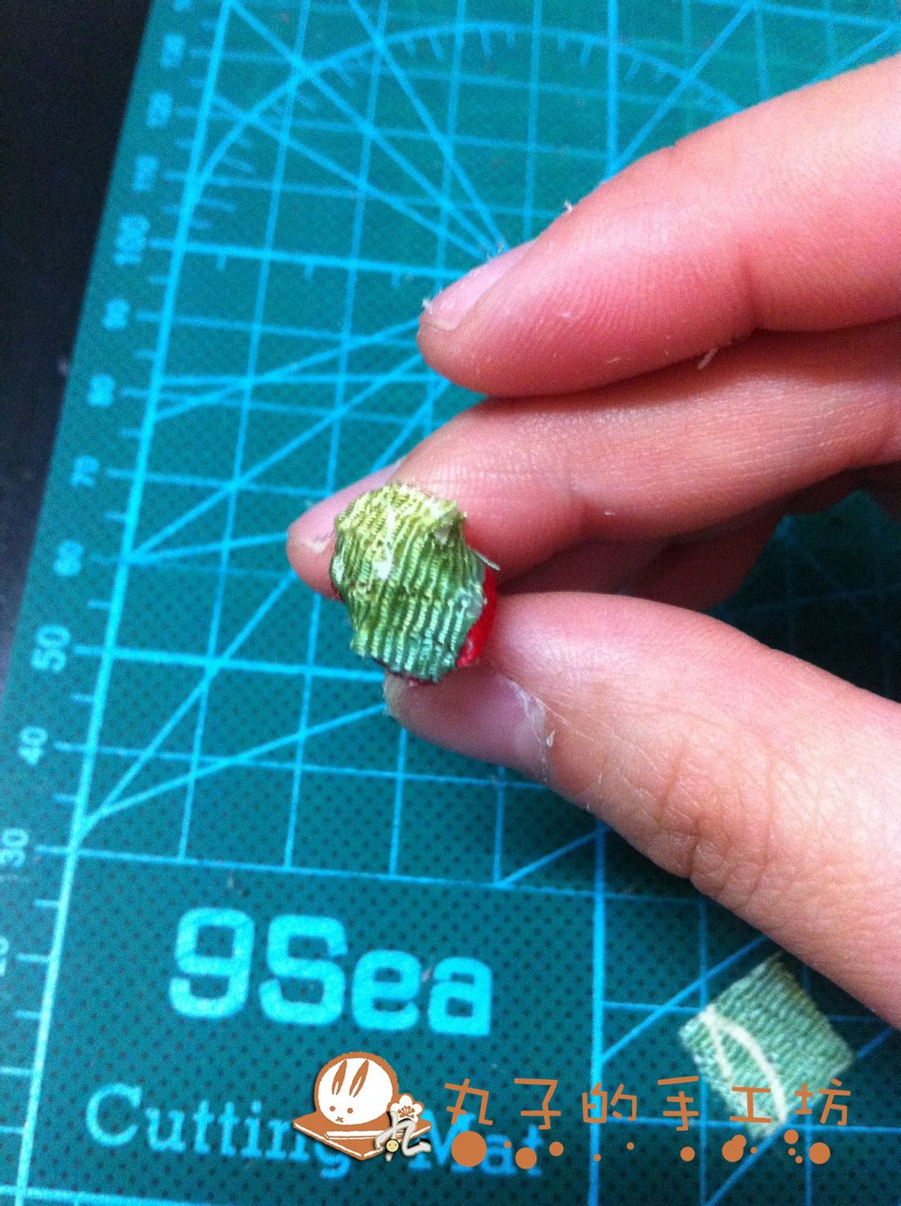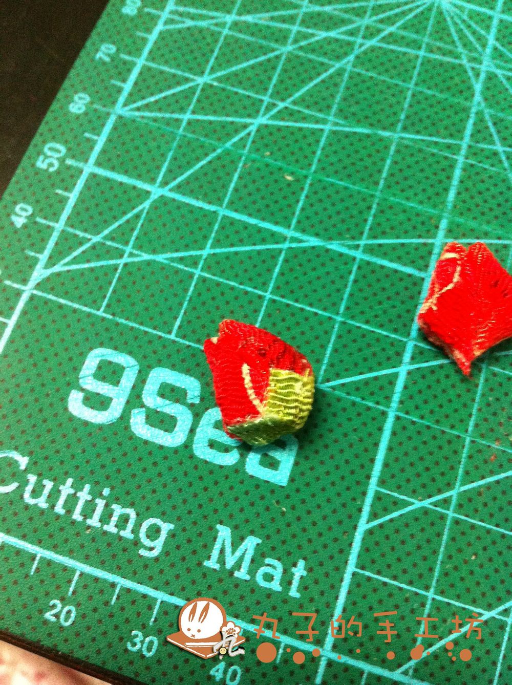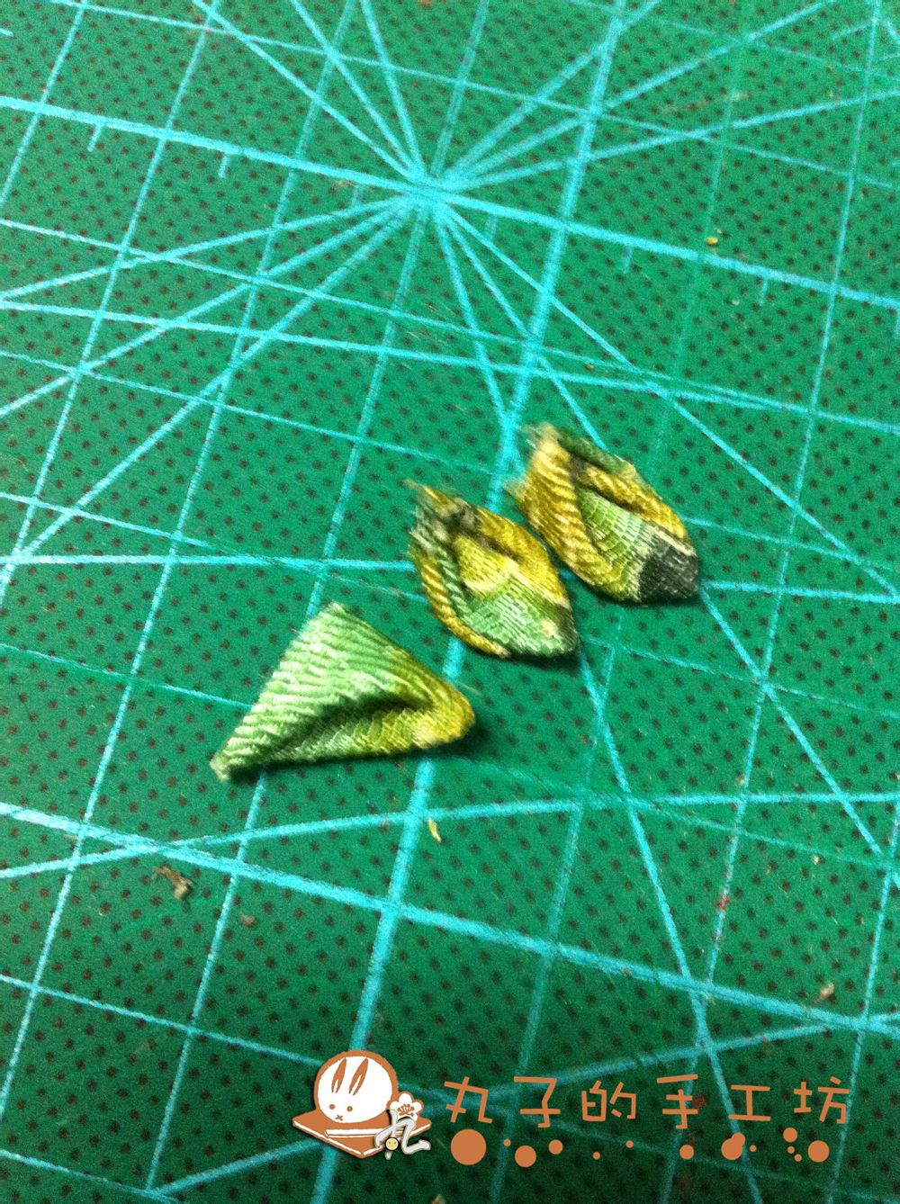 将剩下的2.5X2.5尺寸绿色布片剪成4块,拿出2块