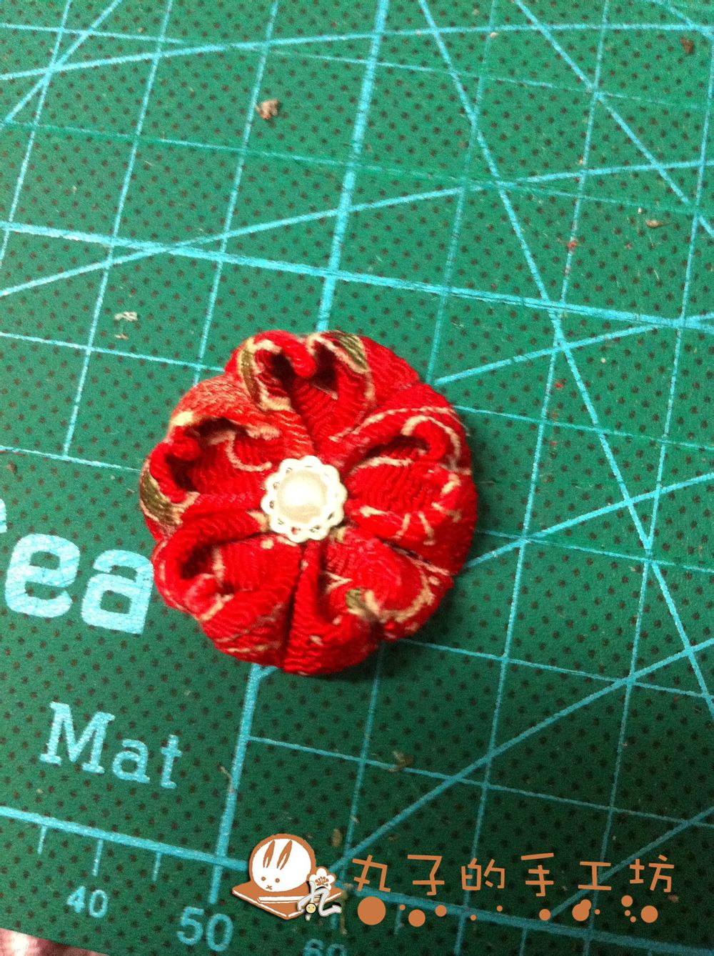 材料汇总 和风绉布红色2.5X2.5cm 绿色2.5X2.5cm4块 绿色5X5CM一块 纸壳一条 同尺寸不织布两条 3cm小发夹一个 半珍珠+钻托1个 酒精胶 E6000 没有出境的圆片不织布一小片