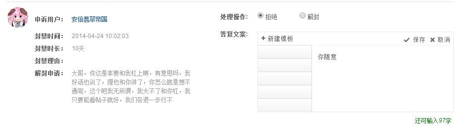 有一个少年,几次在贴吧里申请解封,觉得自己理直气壮,被我拒绝多次依旧执着,简直感人。