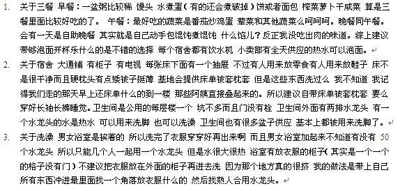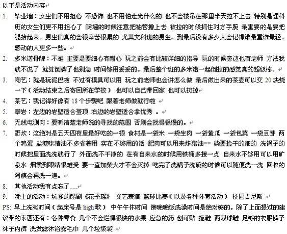 学校电脑太烂回复不了楼中楼= =反正洗澡记得快点,挤得要死连站的地方都没有。。野炊比较好玩但是小心满脸都是灰。。龙池山哪儿的厕所不忍直视= =食堂饭菜不好,记得带好泡面