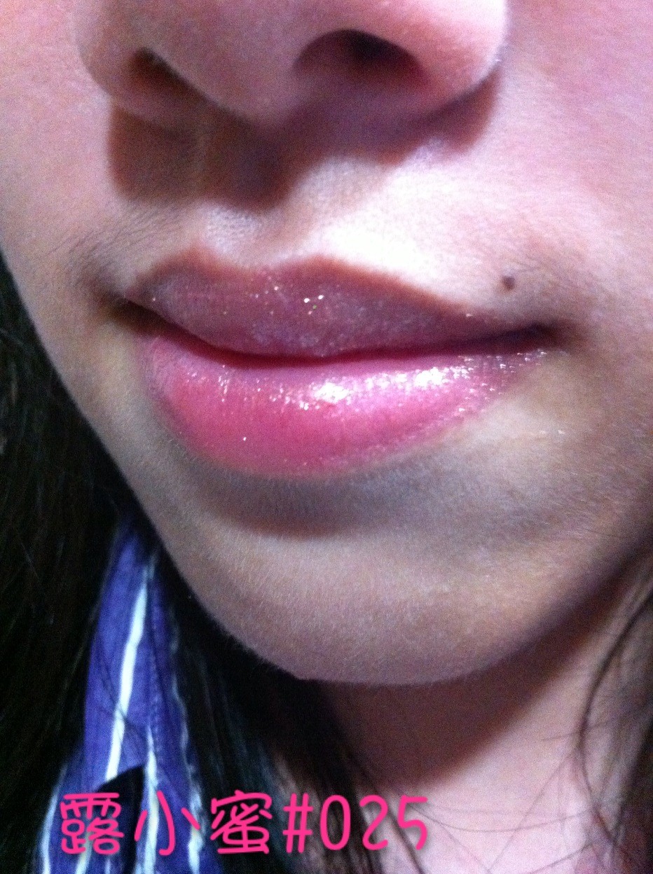 露小蜜025,说是蜜桃色咯,不过挺裸的,带闪,上唇基本看不出颜色,就只能看到一些blingbling的闪~