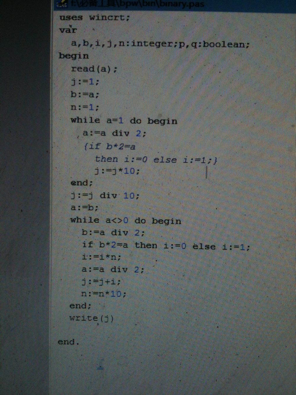 for i := 1 to trunc(ln(num)/ln(2))+1 do write(num shr (i-1) and 1); writeln; 一行