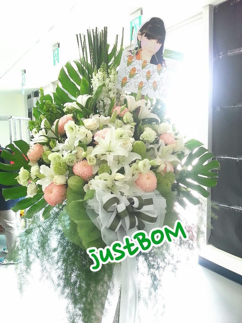 justBOM后台应援①-高架花篮... 我们还特地做了大头娃娃的花卡,可爱吧?!鲜花的配色也好棒!(by Peggy)