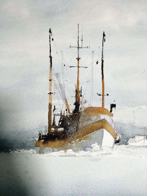 为了更好的呈现画面!我将原先的构图给改了!就变成这样了!画面就由“天空、大海、2艘渔船、以及远处的山还有浪花组成”这样的画面就变的很好看也很简单!所以以后大家第一手拿到照片,要仔细的研究下你手中的照片适不适合构图!不然你画的再好看也会效果不好的!这是一件很让人抓狂的事情!