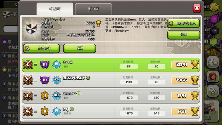 【我们终究还是兄弟】招收7本以上4农5农活跃玩家,赛季进攻至少100,一周打一次部落战。二营【我们一直都是兄弟】为休闲营,招收高本发展型玩家和潜力小号,随时可加入一营参与部落战。公会是由现实中的一群朋友同学组成的,和谐有爱,四星五星兵秒捐,部落战发飞龙法师守家。我们只需要你的活跃,欢迎加入。
