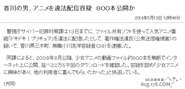 日本警视厅网络犯罪对策课13日发表成,他们将住在日本香川县三木町的无职人员小川友洋(38岁)犯罪嫌疑人逮捕,理由是该名男子在网上使用共享软件将人气动画「心跳!光之美少女」的动画在网络上公开下载。