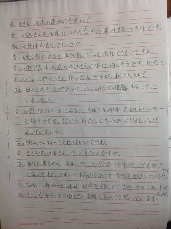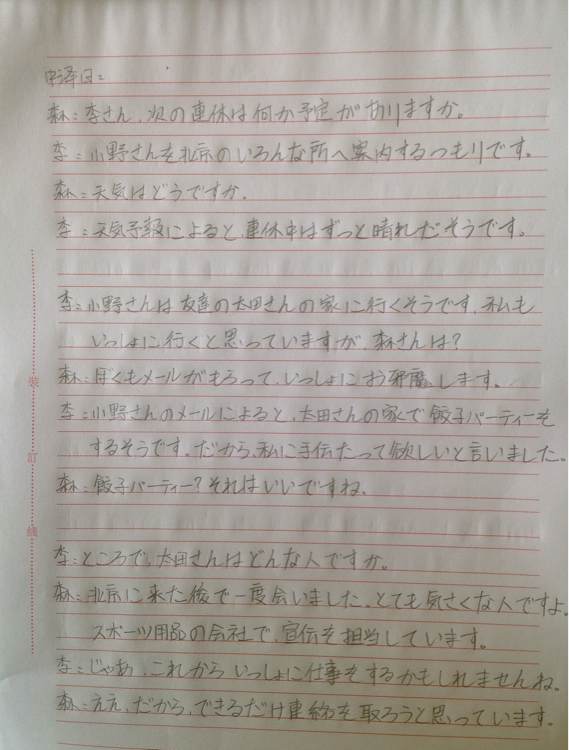 ① 最近手纸より电话を利用する人が多くなりました。电话はほんとうに便利なもので、私たちの生活に非常に役立っています。电话は最初、远くにいる人に话したい时、また用事を知らせる时に使いましたが、今は灾害や急病、盗难などが起きた场合も、电话で助けを求めることができます。また电话で买い物、切符の予约、そして赠り物をすることもできます。最近比起信件用电话的人变得多了。电话真的很方便、并且对我们的生活帮助也很大。电话一开始是用于想跟在远方的人交谈还有通知一些事情的、现在也用于在发生灾害、急病或者盗窃之类的时候的求助。还有用电话购物、预定车票,还可以用电话送礼。