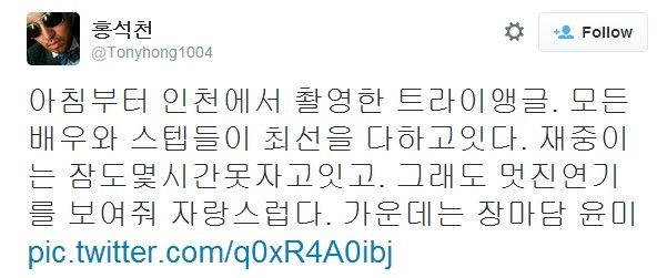 洪锡天20日下午在自己的twitter微博上写道:“从一大早开始在仁川拍摄“Triangle”。所有的演员和工作人员们正在竭尽全力。在中是连觉都几乎没的睡…但依然带来了精彩的演技”。并与文章一同刊登了这张照片。
