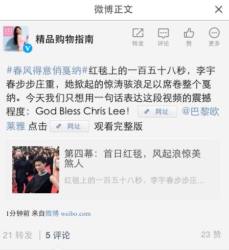 红毯上的一百五十八秒,李宇春步步庄重,她掀起的惊涛骇浪足以席卷整个戛纳。今天我们只想用一句话表达这段视频的震撼程度:God Bless Chris Lee!http://t.cn/RvUfDep @巴黎欧莱雅 点击http://t.cn/RvAlY2h 观看完整版