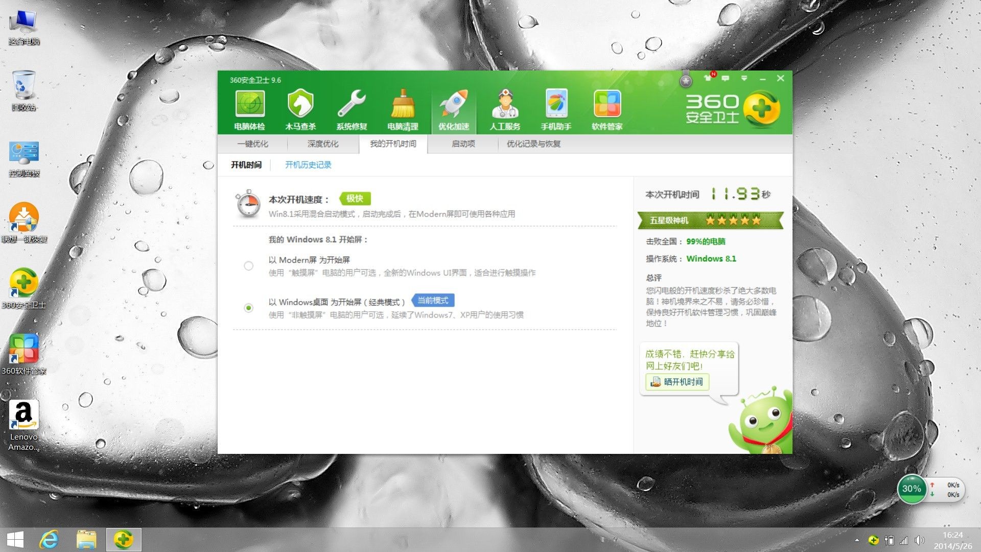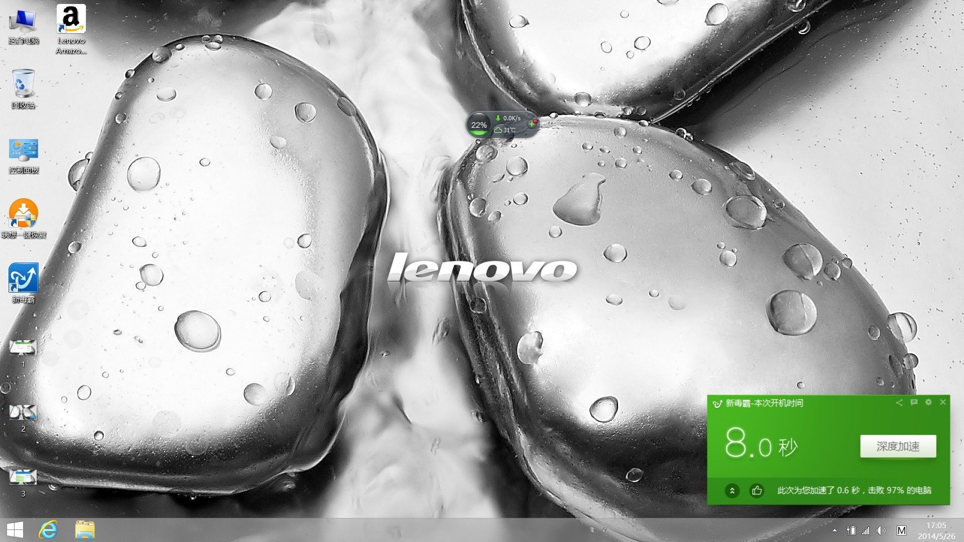 最后总结下:出厂预装的Windows 8.1系统默认是开启了win8的快速启动功能的,正常关机再开,速度要比重启电脑快很多,因为重启是不算快速启动的,只有关机后再开才算,另外关机建议用隐藏在侧边栏设置里的电源关机,这样下次开机速度也会快点,开机速度不代表一切,机械硬盘即使开机显示时间为10秒,但是在刚开机的时候,点开很多东西仍然很慢,鼠标不停的在画圈圈,原因是很多程序都还没有响应过来,彻底解决开机速度和响应速度的问题,最佳方法仍然还是扩展固态硬盘,还是那句话,要想速度快就得加固态