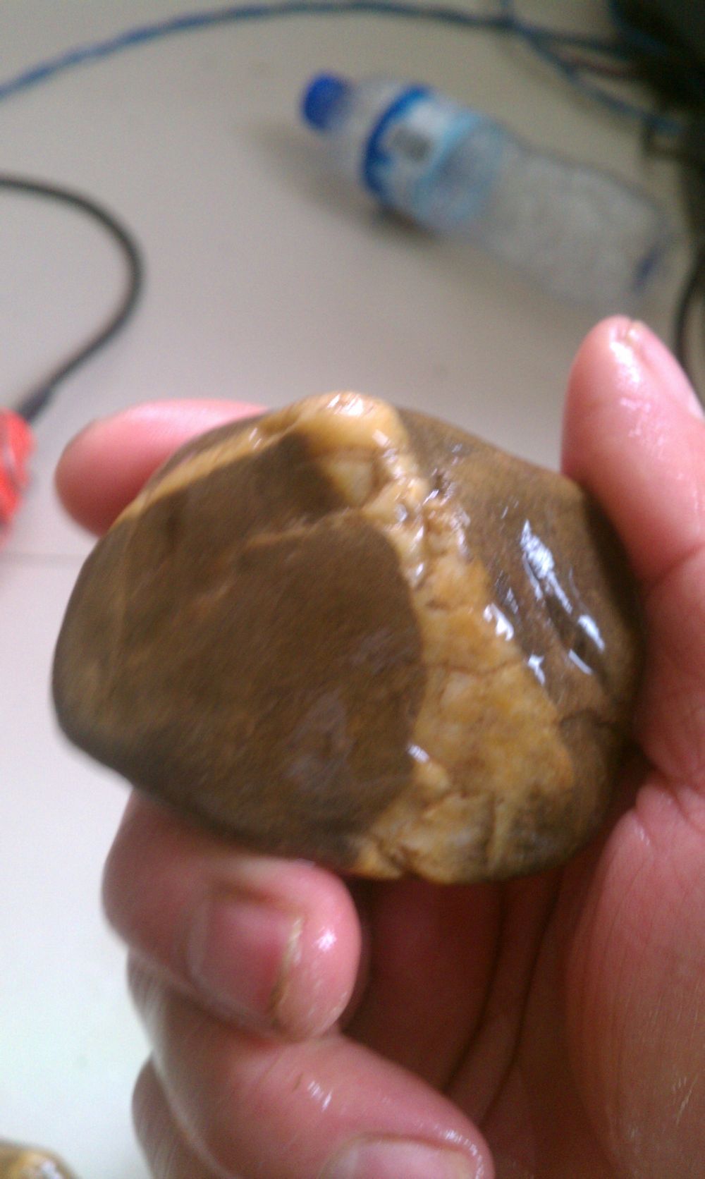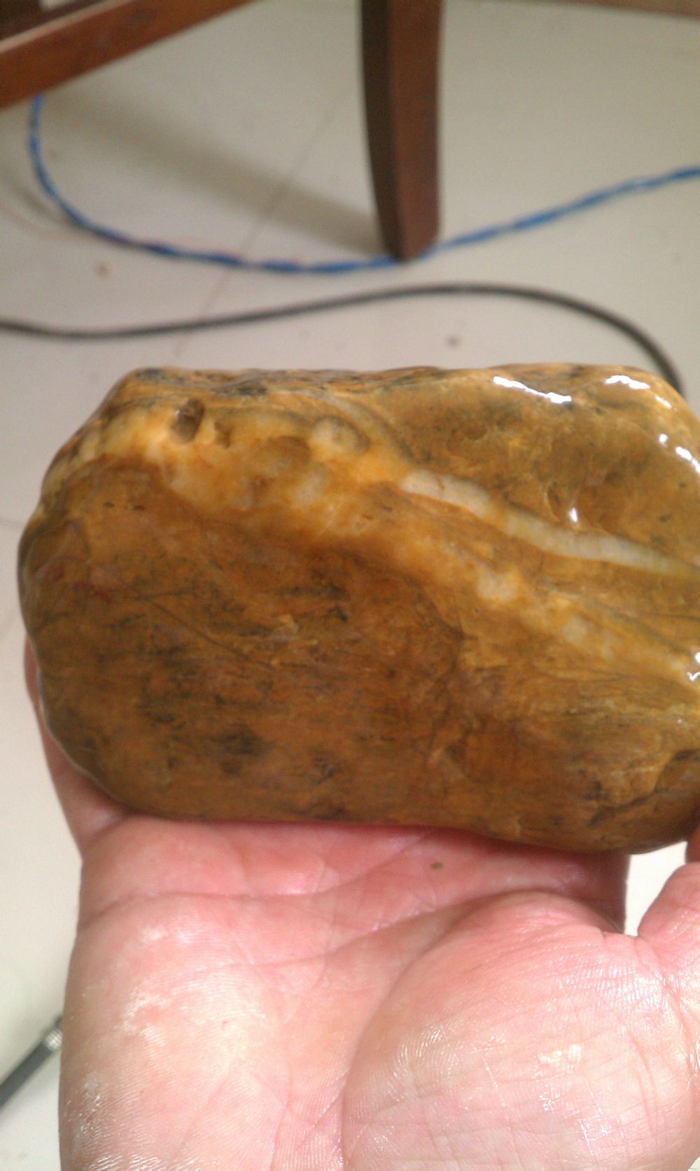 说说这块吧,应该是一只小羊,说实在的非常遗憾的是在小羊的鼻子上方有一点自然磕伤,否则的话这块石头就是一个难得的精品了,可是没办法石缘就这样了。整块石头非常华润跟抛光了一样。来自长江支流。
