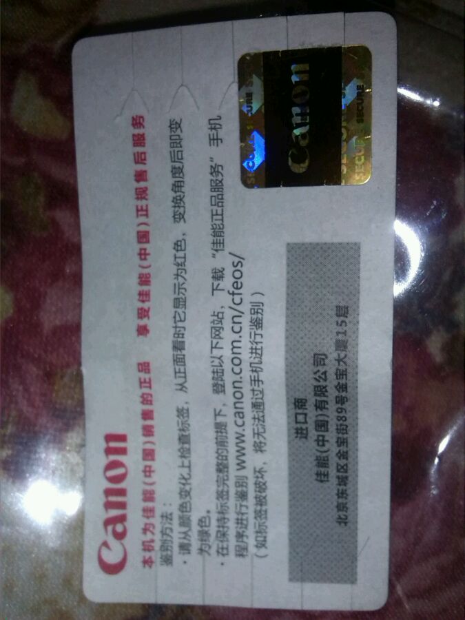 撕封口标签的时候一定要小心,因为背面有NFC射频卡,撕坏了就不好了,你用有NFC射频技术的手机在佳能官网下载佳能正品服务,官网上有具体的图片教程。图是我的NFC封条