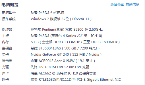 系统换64位不然只能识别2.9g,cpu很老了,e5700主频3.0ghz的才350元,显卡不是看内存的,商家经常拿内存说,就是糊你们,现在显卡出到gt800系列了,gt240淘汰了,但是这显卡玩lol绝对没问题