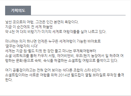 这是一档SBS在世界杯前夕前往巴西,通过SNS介绍巴西的风土人情与美食的节目