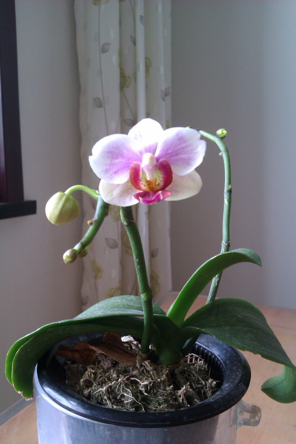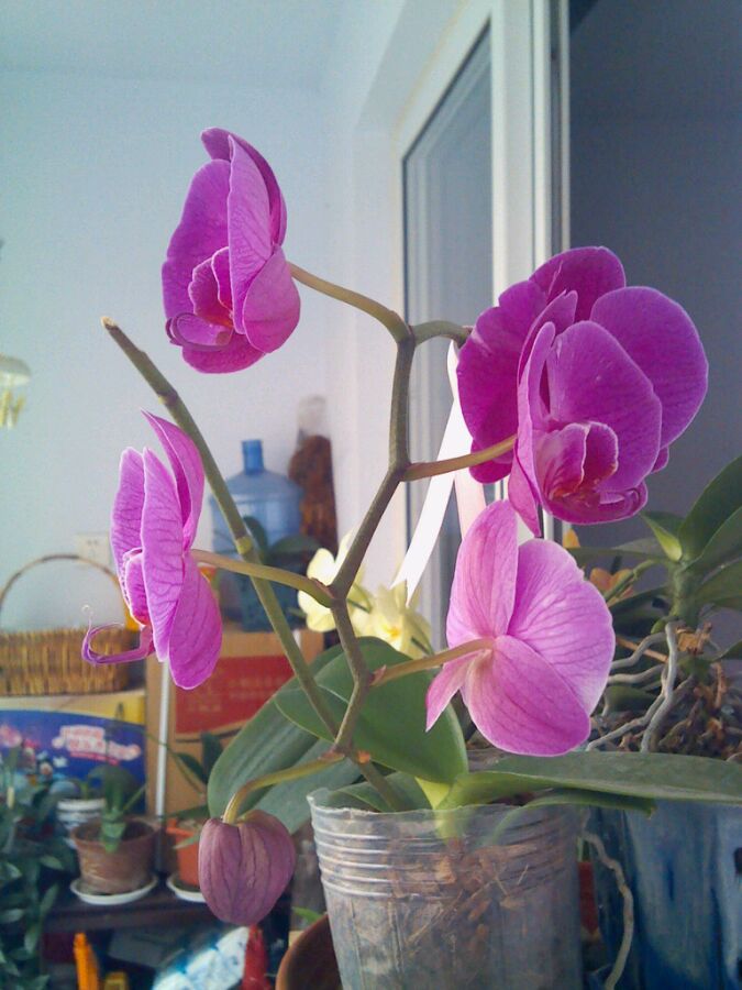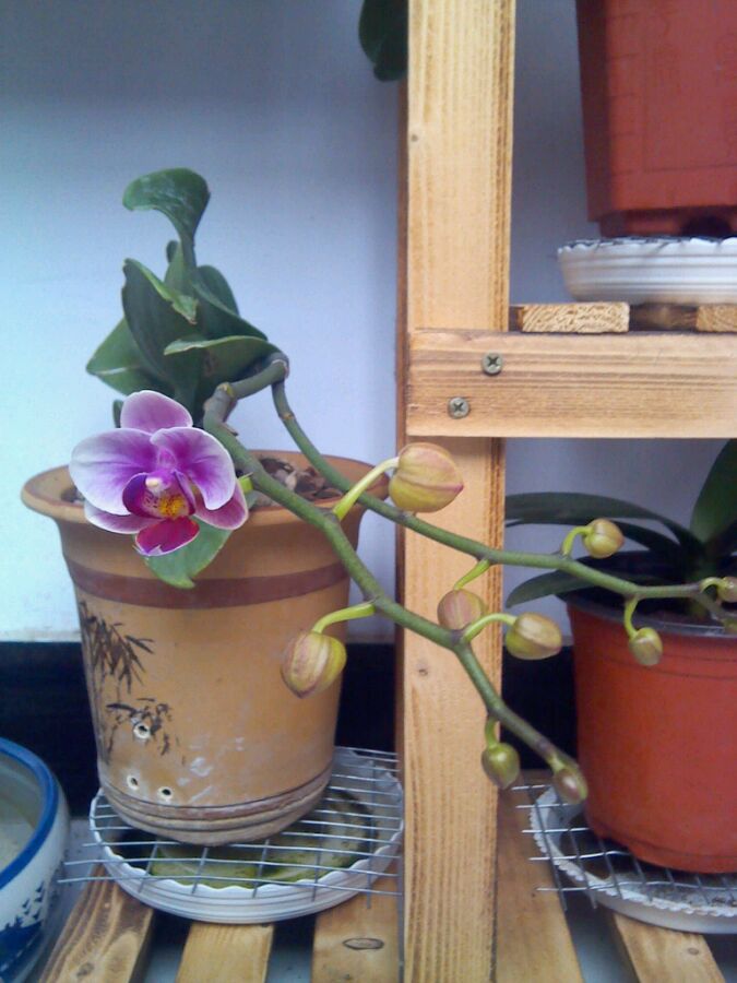 第一次看见给兰花整形的,话说你最右边那盆花盆不合适吧!