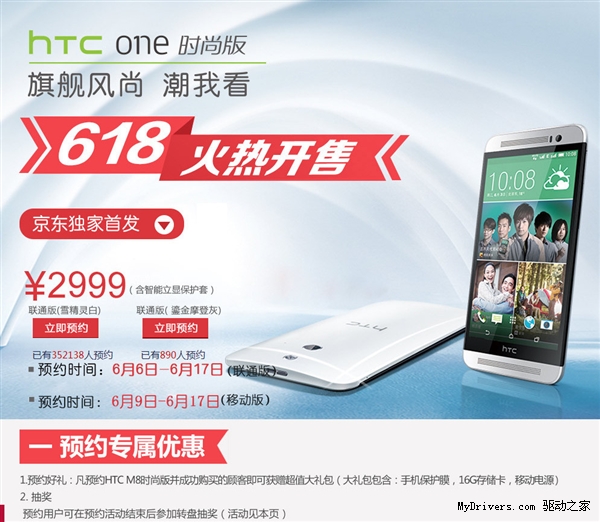 目前京东商城已经开启了HTC One时尚版的预约工作,联通/移动版的售价均为2999元,但包含智能立显保护套,相对来说这个价格还是非常不错的。此外京东还将赠送每位成功预约并购买的用户一份大礼包,包含手机保护膜、16GB存储卡以及移动电源,可以认为是超值了。