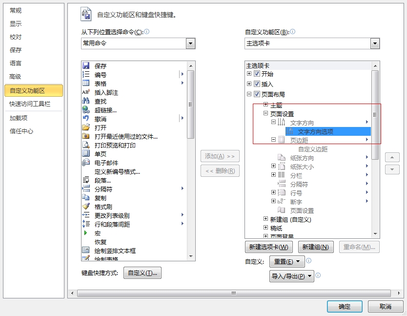 RT 本来在 页面布局 的 页面设置 的最左边会有文字方向选项 我的怎么平白无故消失了? 可是在自定义功能区里面 明明有文字方向啊! (新建组 里面的文字方向是我添加上去的 可是也是灰的 点不成)??? 跪求大神解答!!!