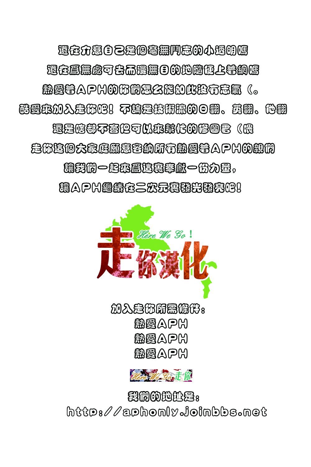 走你是服务于APH ONLY的汉化组,我们的汉化范围主要是本家汉化和全员向同人汉化,涵盖本家竹林短篇、本家旅游志、同人漫和同人文等等