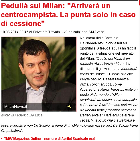 知名的意甲转会专家佩杜拉对米兰今夏的转会进行了点评:“米兰夏天的转会很清晰,视巴洛特利的情况而定。梅内的交易已经完成,只待体检。帕洛斯基的归属仍是一个问号。米兰将引进一名新的中场,卡塞米罗是理想的人选。前锋的引进取决于巴洛特利是否能换取到满意的现金。德西利奥和巴神一样,我希望不会被出售。因为他代表着这支年轻的米兰。”